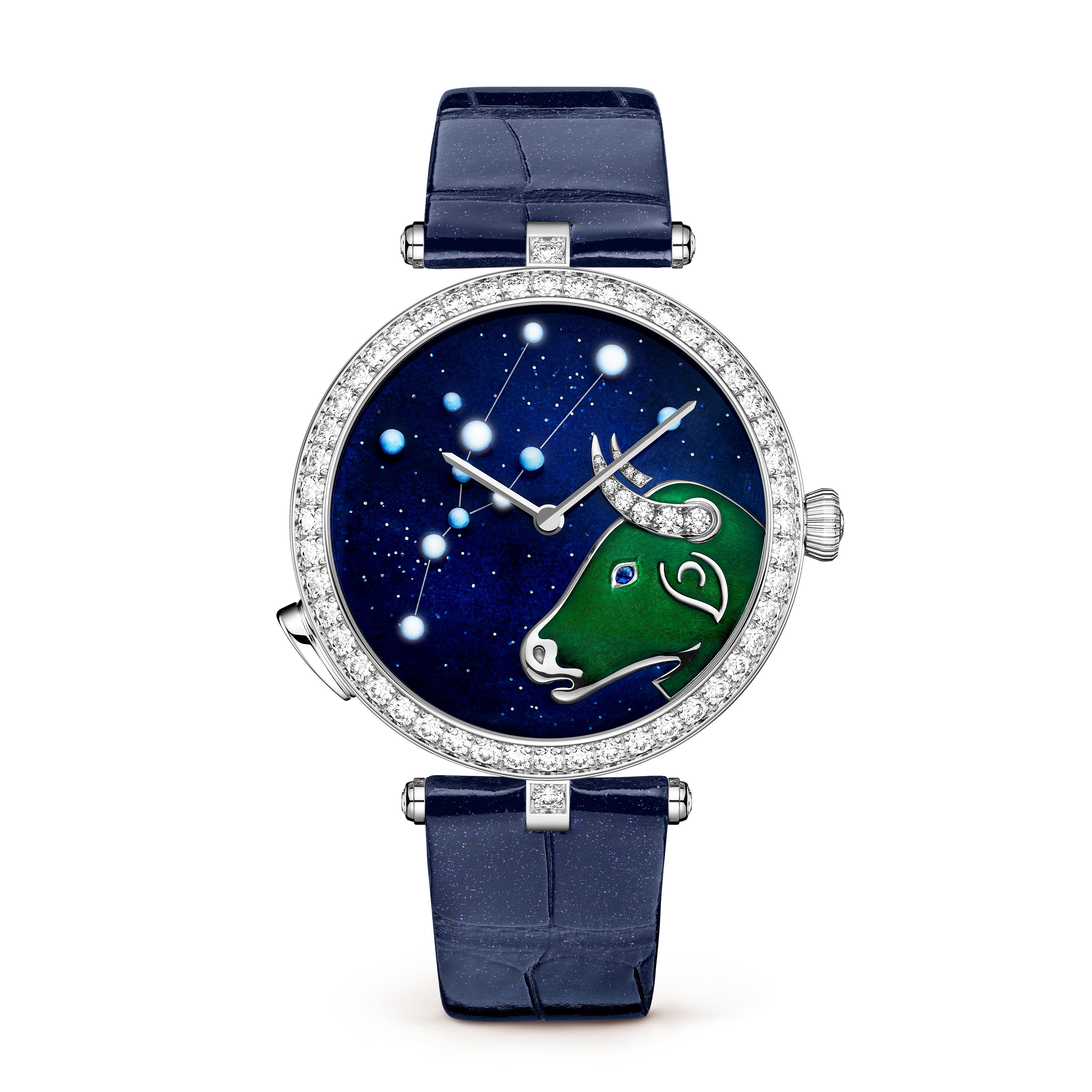 Véritable invitation à vivre au rythme du cosmos, l’ensemble de douze modèles féminins Lady Arpels Zodiaque Lumineux recrée le scintillement des étoiles à travers un module exclusif lumière à la demande. Délicatement sculptés et sertis à la main, les signes du Zodiaque contrastent sur un fond en émail bleu pailleté, faisant écho à la voûte céleste. Signe de terre, le Taureau est traditionnellement associé au calme et au raffinement.
