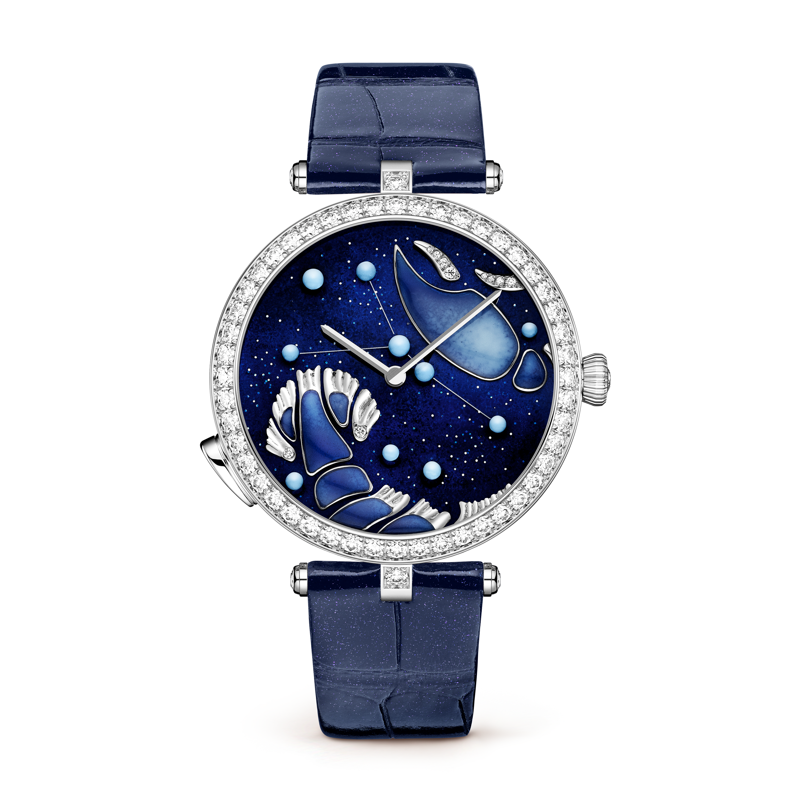 Véritable invitation à vivre au rythme du cosmos, l’ensemble de douze modèles féminins Lady Arpels Zodiaque Lumineux recrée le scintillement des étoiles à travers un module exclusif lumière à la demande. Délicatement sculptés et sertis à la main, les signes du Zodiaque contrastent sur un fond en émail bleu pailleté, faisant écho à la voûte céleste. Signe d’eau, le Cancer est traditionnellement associé à la sensibilité et à l’intuition.
