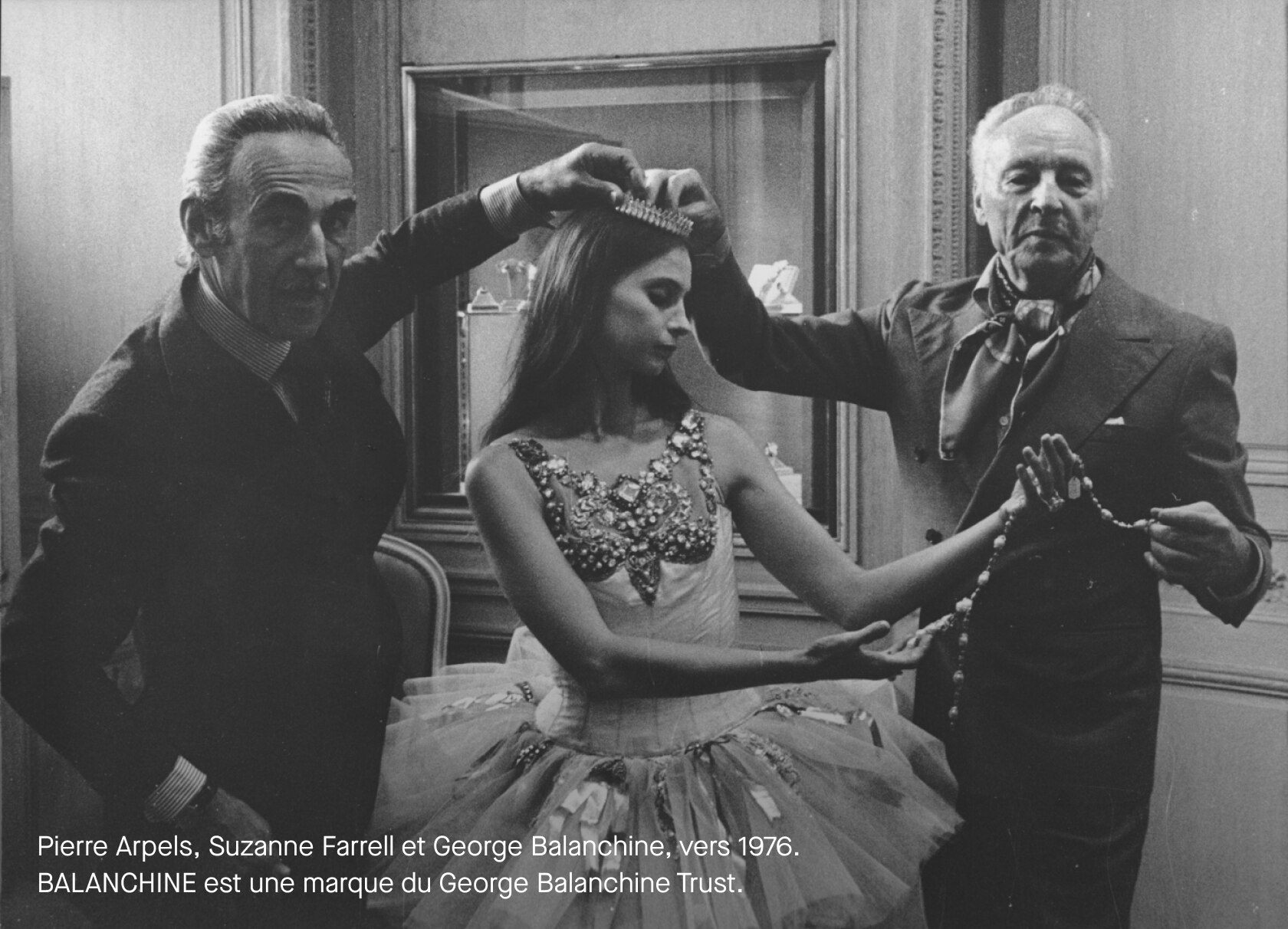 De la rencontre entre Claude Arpels et George Balanchine, cofondateur du New York City Ballet, naît l’idée d’un ballet dédié aux pierres précieuses. Présenté en avril 1967, Jewels se compose de trois volets : Émeraudes, Rubis et Diamants respectivement sur les musiques de Fauré, Stravinsky et Tchaïkovsky.
