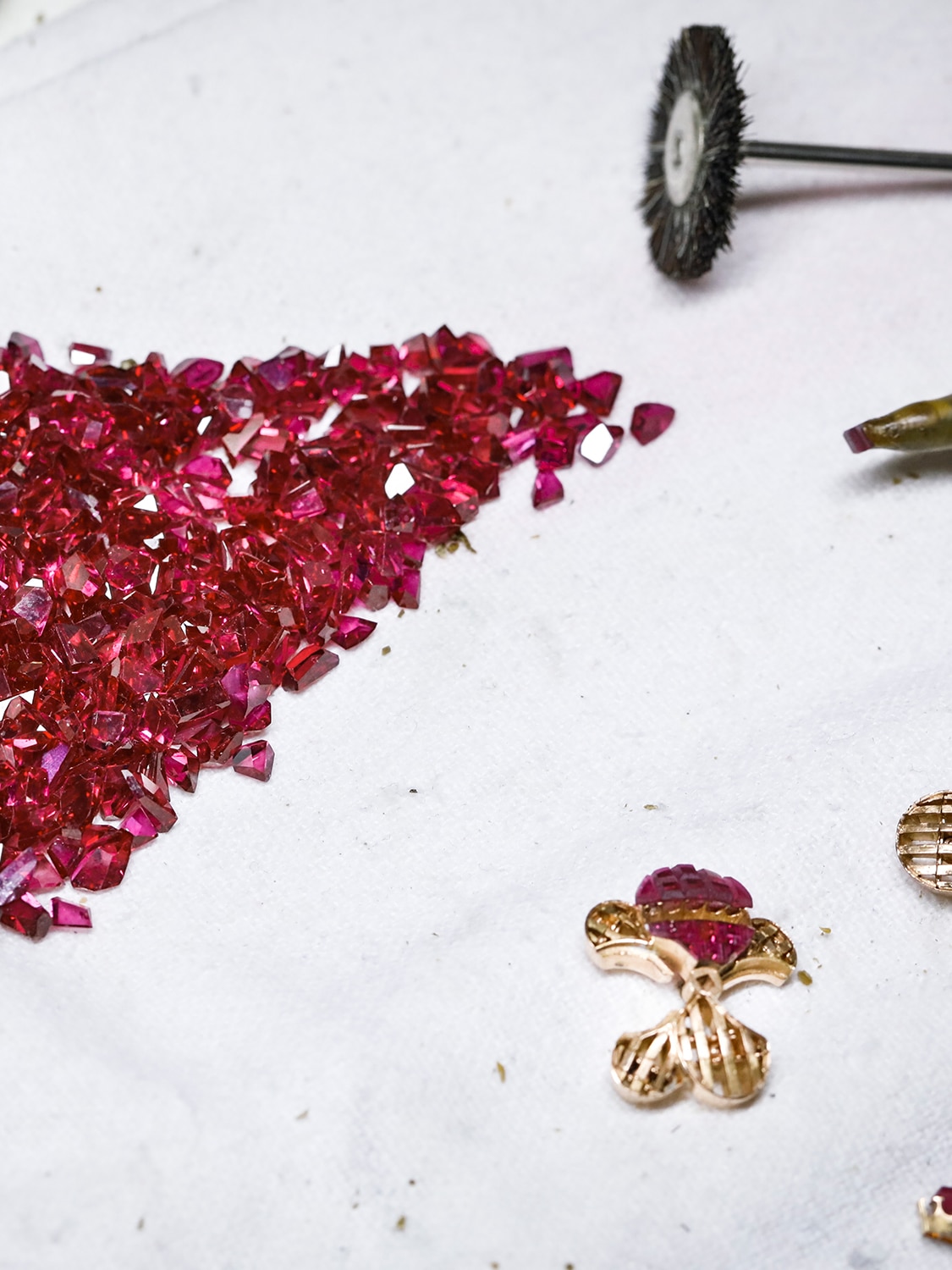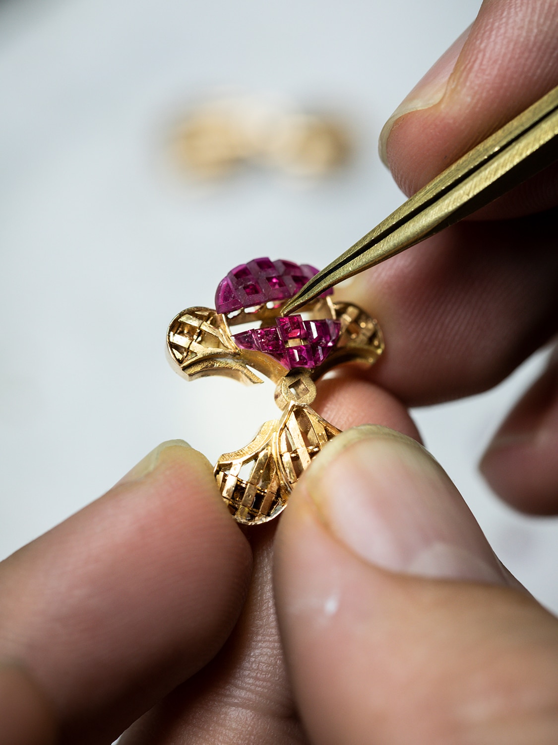 Questa tecnica riflette la creatività che anima la Maison fin dalla sua fondazione, e permette di celare le parti in metallo mettendo in evidenza le pietre preziose: principalmente rubini, ma anche zaffiri, smeraldi o diamanti. Una volta incastonate, le gemme, precedentemente selezionate con cura, ricoprono perfettamente la superficie e le conferiscono una luminosità vellutata.