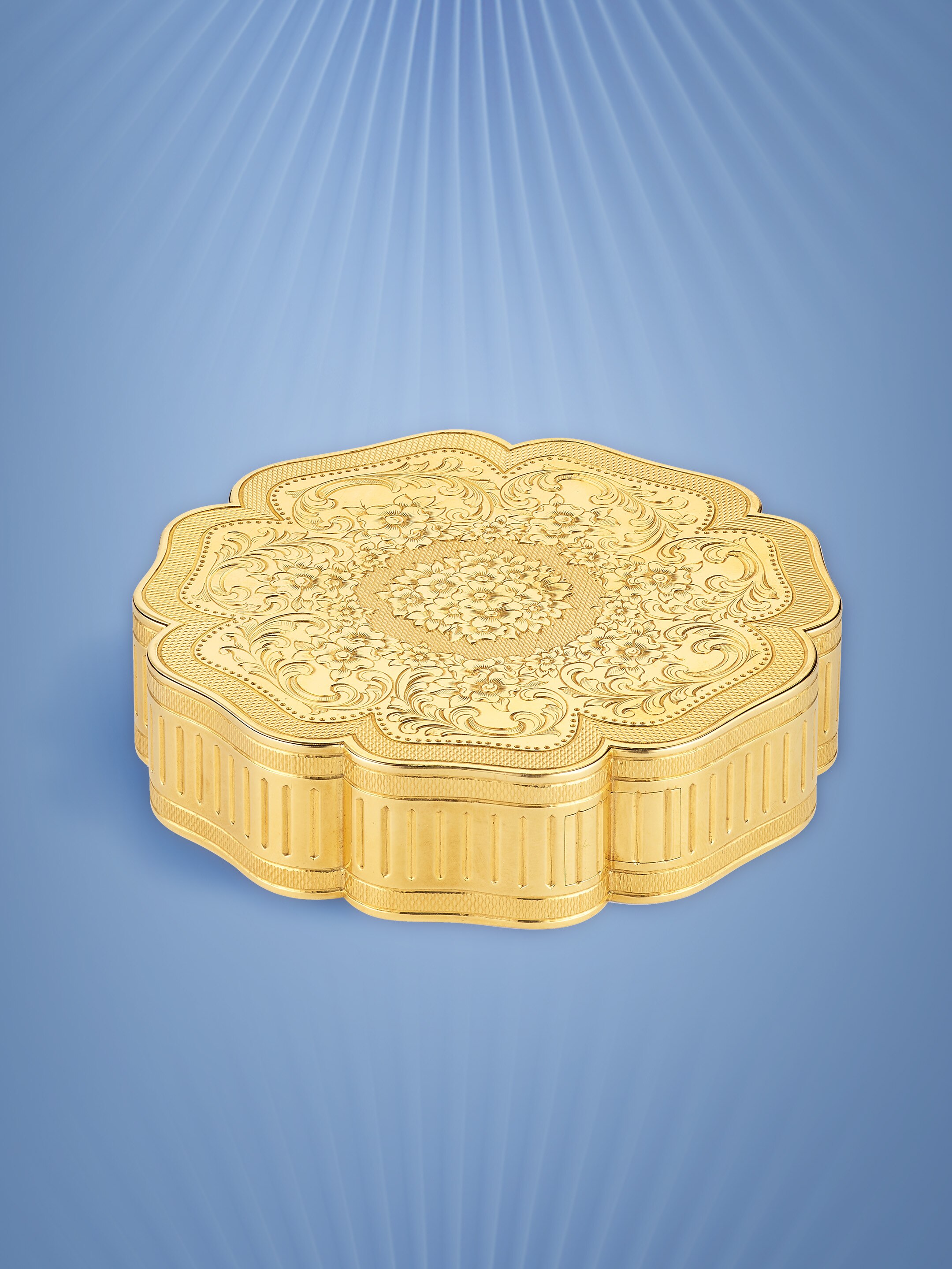 This 1950 powder case attests to the Maison’s constant taste for creating precious accessories. Its shape evokes a flower, a source of inspiration Van Cleef & Arpels holds dear since its foundation. This piece is also reminiscent of the Rococo artistic style which occurred during the 18th century in France, both for the arabesque motifs that adorn its lead and the guilloché technique used to create them. This savoir-faire consists of engraving straight or curved lines onto the metallic surface of a piece.