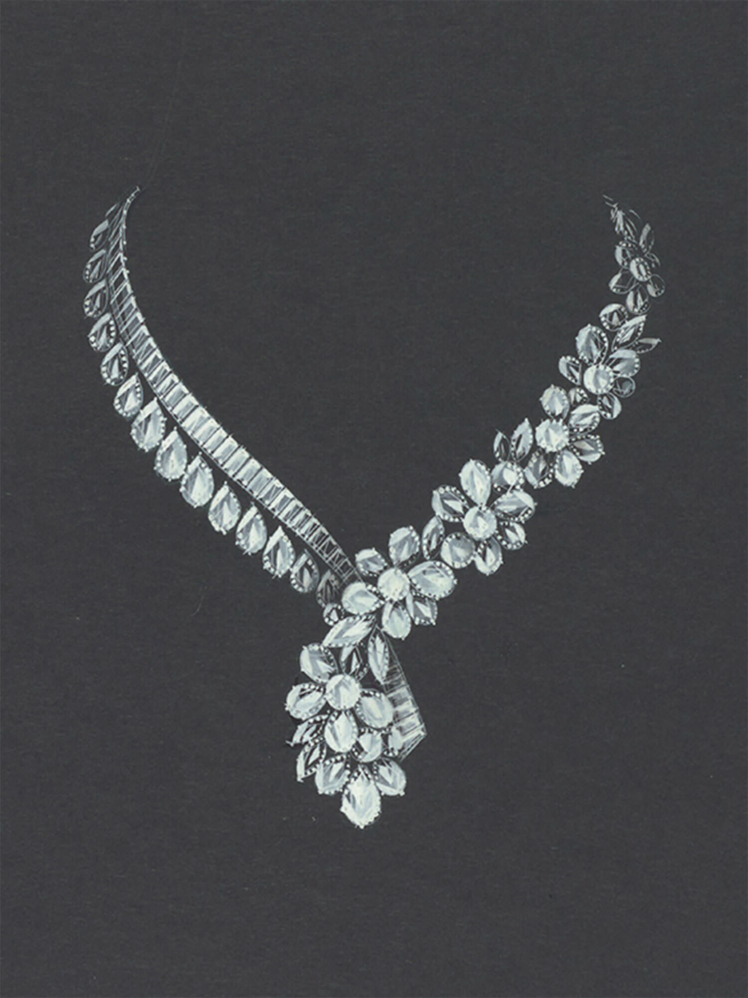 Drawing featuring the Blue Heart diamond set as a pendant on a necklace, circa 1953Van Cleef & Arpels Archives