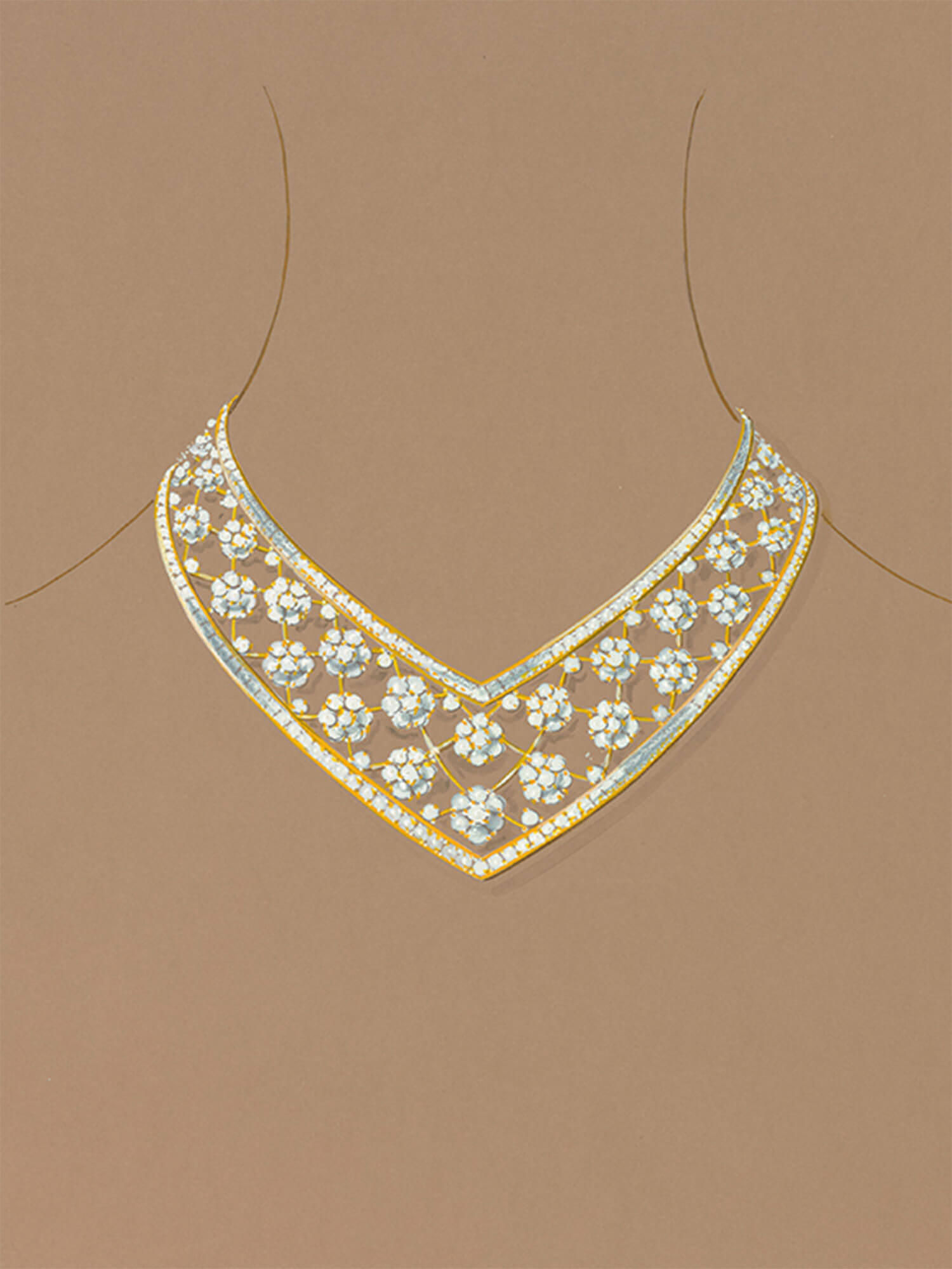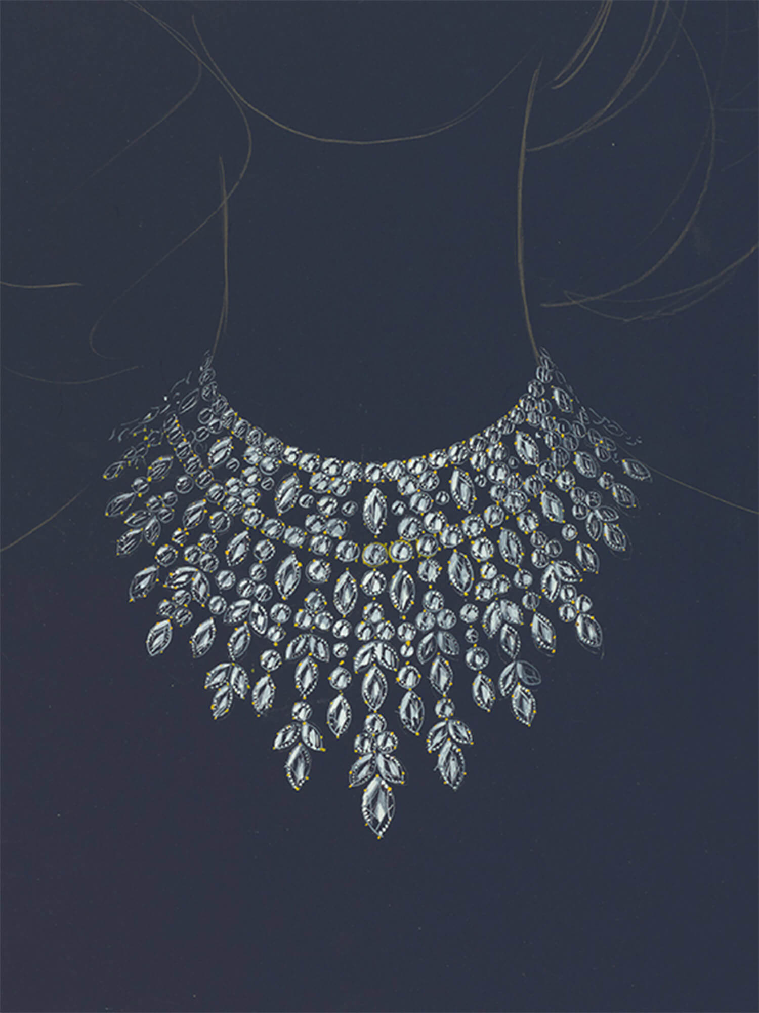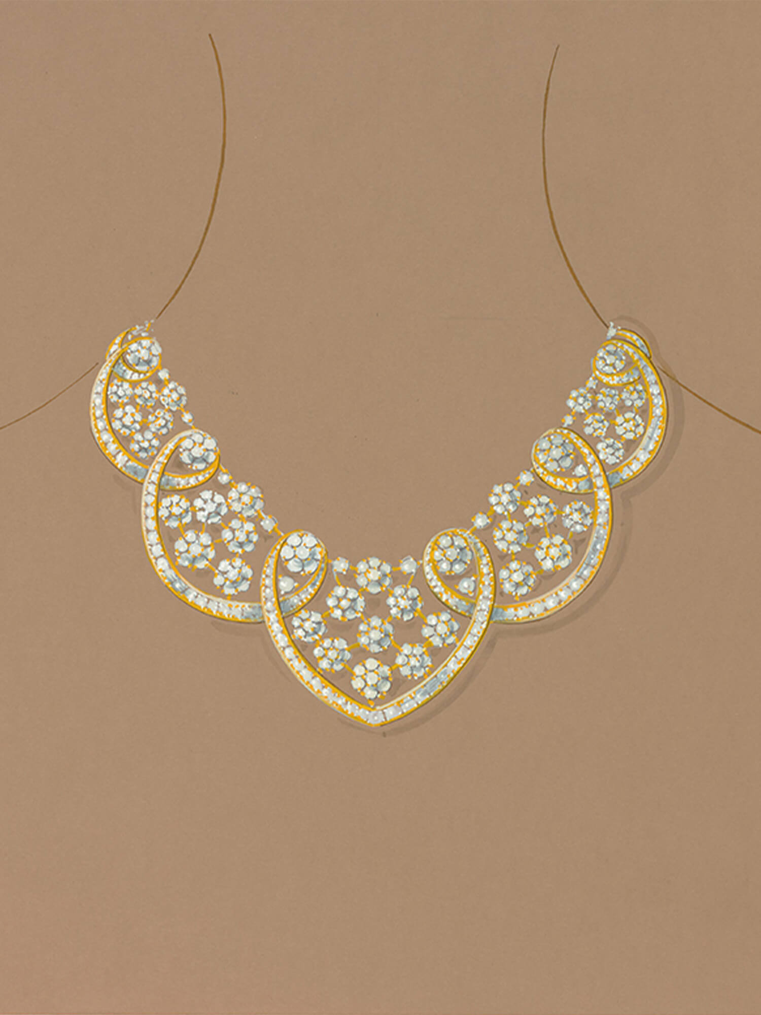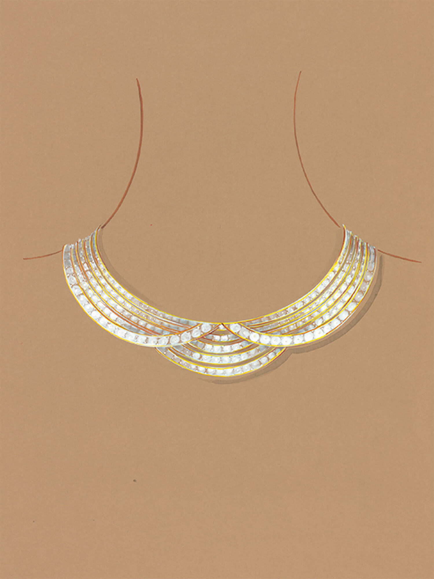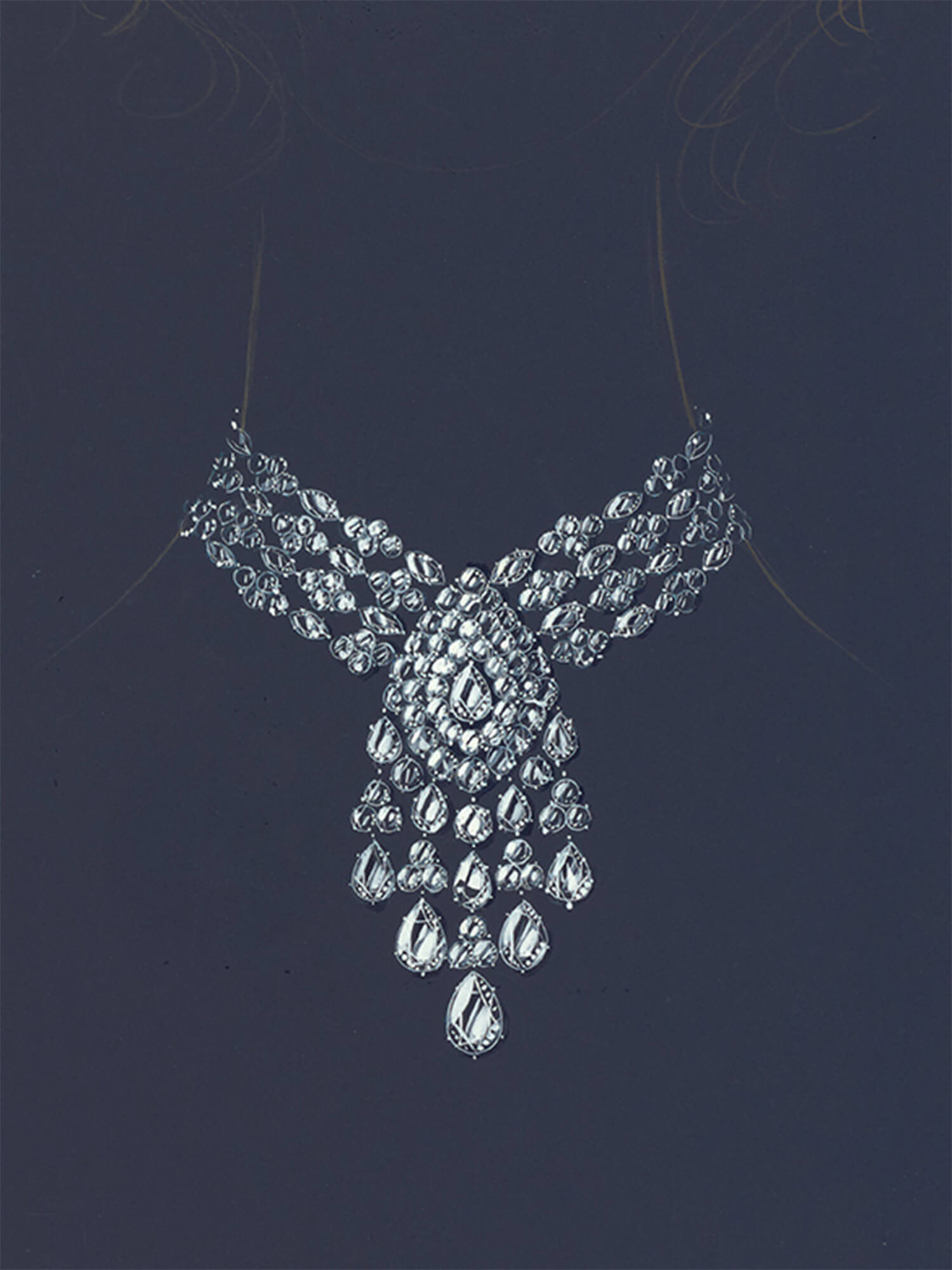 Reinterpreting the river of diamonds design, in the 1960s the Maison created jewelry pieces alive with shimmering poetry: composed of delicate flowers or geometric motifs, these exquisite creations, set in platinum or yellow gold, beautifully accent the neckline of elegant women.