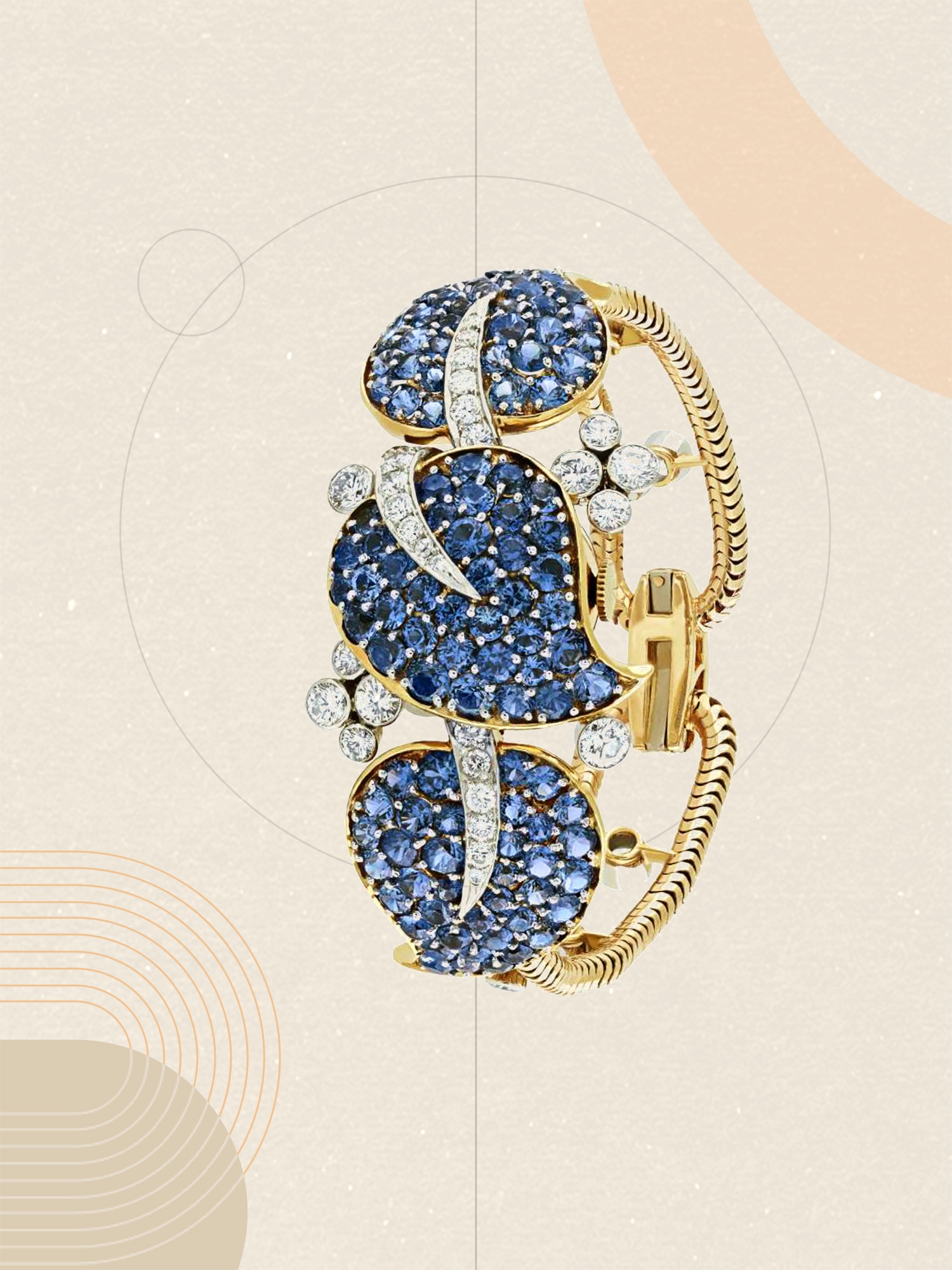Yellow gold, platinum, sapphires, enamel, diamonds