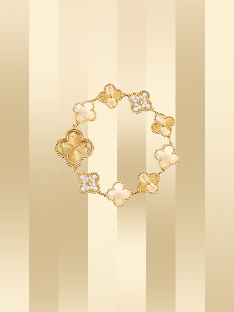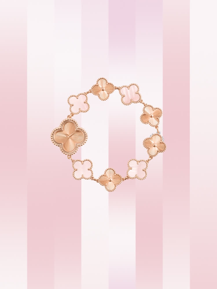 Sometimes white, sometimes gray, pink, or golden, mother-of-pearl distinguishes itself through its iridescent shimmer that ranges from pink to green. The four variations of mother-of-pearl have adorned the iconic Alhambra lucky charm since the 1980s.