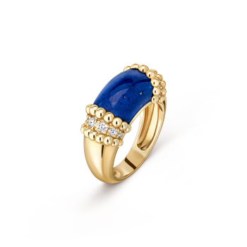 Lucky Spring® 作品採用瑪瑙製作:上半部分的翅膀為藍色瑪瑙,葉片則為綠色瑪瑙。世家從淡雅到濃郁的藍色和綠色瑪瑙中,僅挑選極少數色澤均勻而明亮的寶石,打造出和諧悅目的組合。白色珍珠母貝的虹彩進一步提升作品的美態,因罕見的光澤和於光線下反射的細膩光芒而成為備受世家鍾愛的有機材質。
