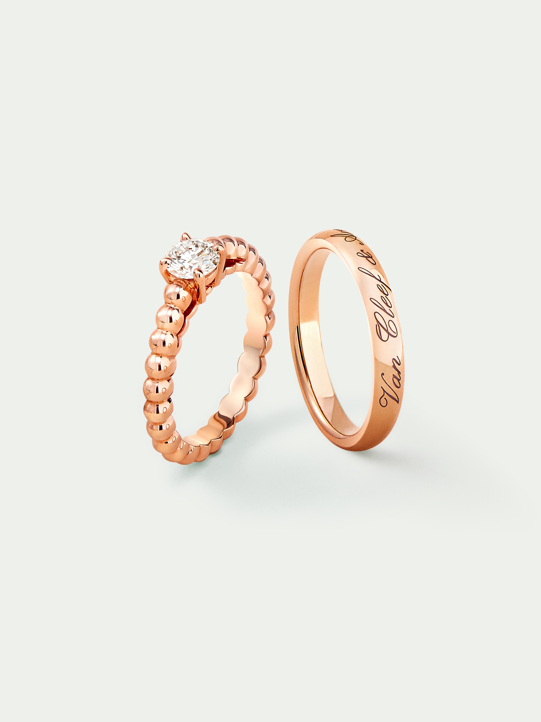 À travers la brillance de l'or et l'éclat des diamants, les alliances Van Cleef & Arpels symbolisent l'amour qui unit deux personnes. Elles peuvent se porter seules, avec une bague de fiançailles ou encore associées à un second anneau, selon le caractère unique de chaque histoire.
