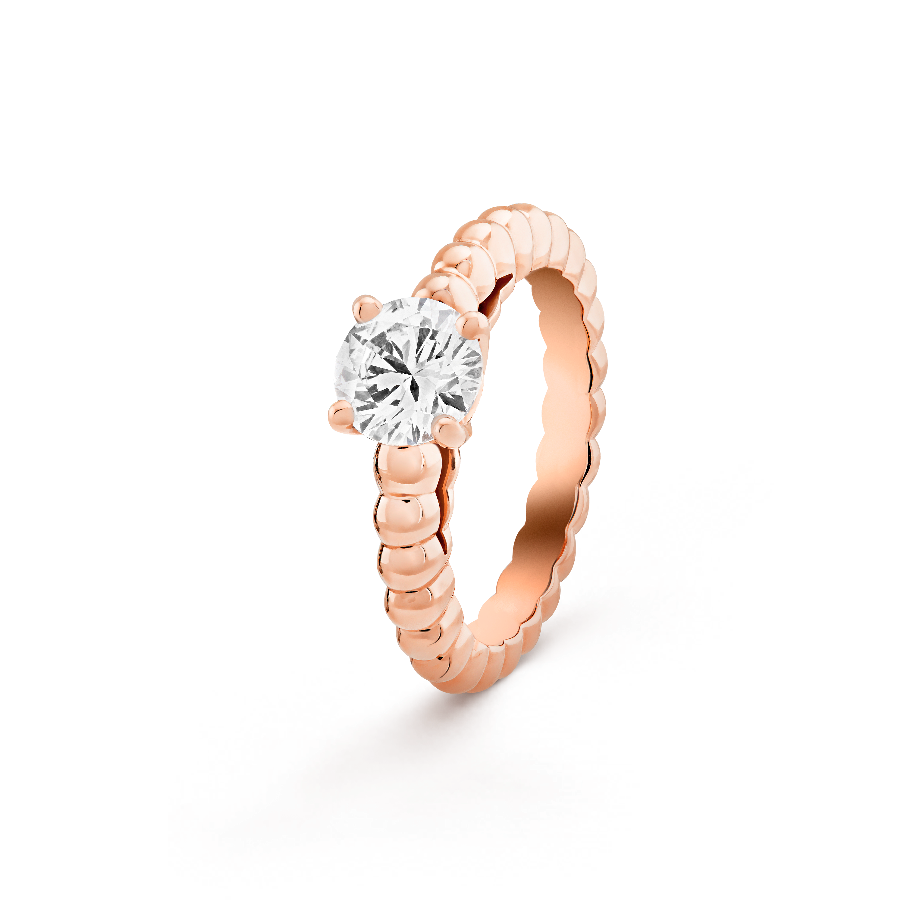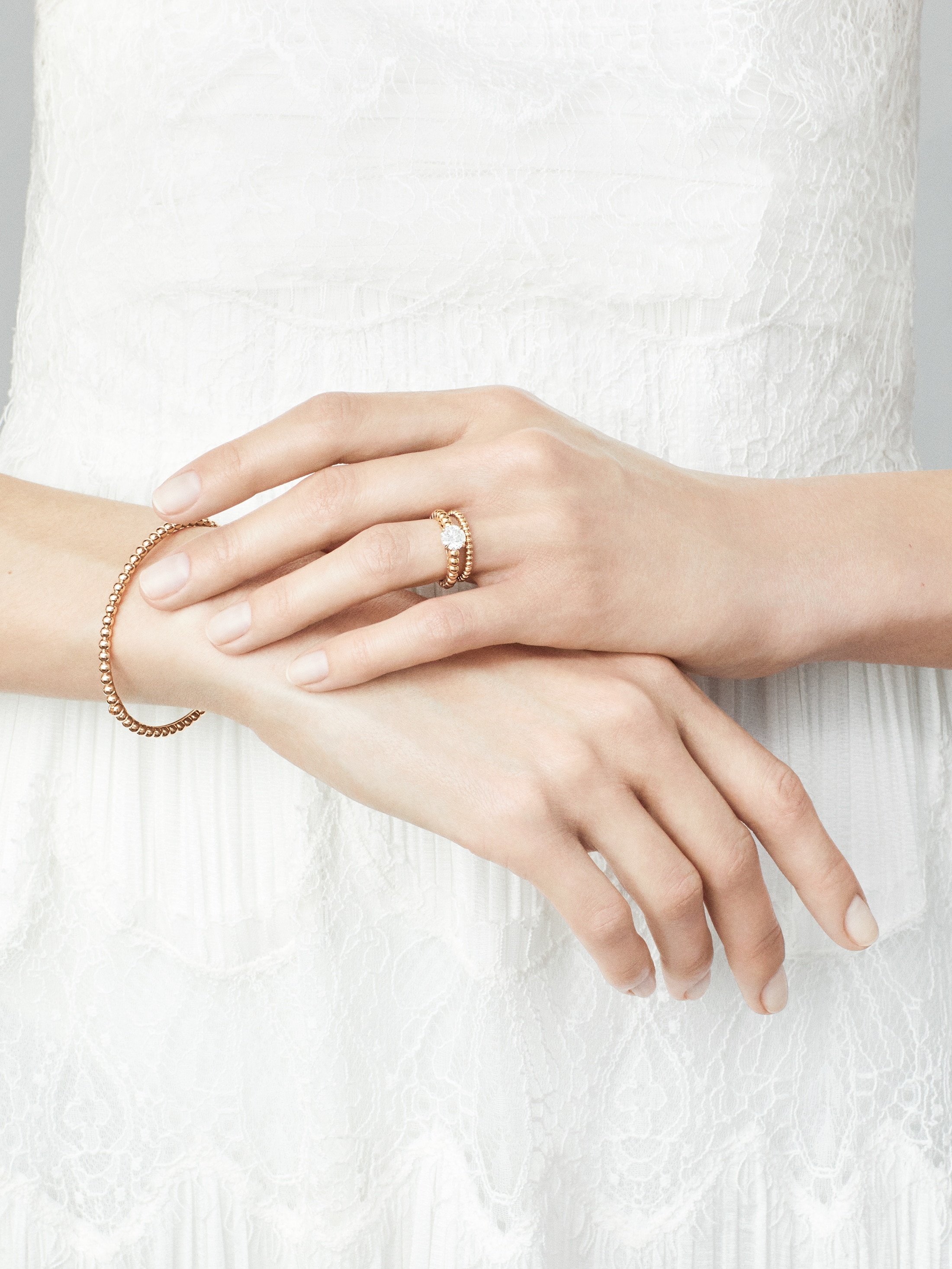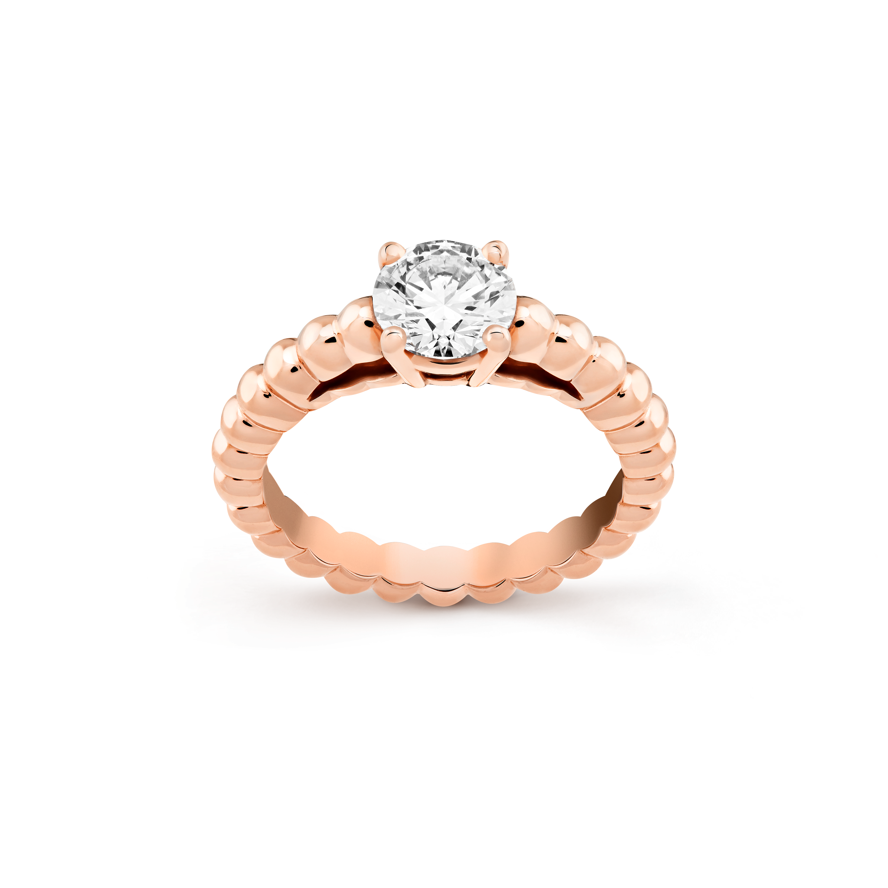 Tout en rondeur, le solitaire Perlée® célèbre un savoir-faire emblématique de la Maison : les perles d'or qui ornent le contour de nombreuses créations, dans une vision douce et ludique de la joaillerie. L'anneau perlé aux reflets chatoyants met en lumière un superbe diamant de centre.