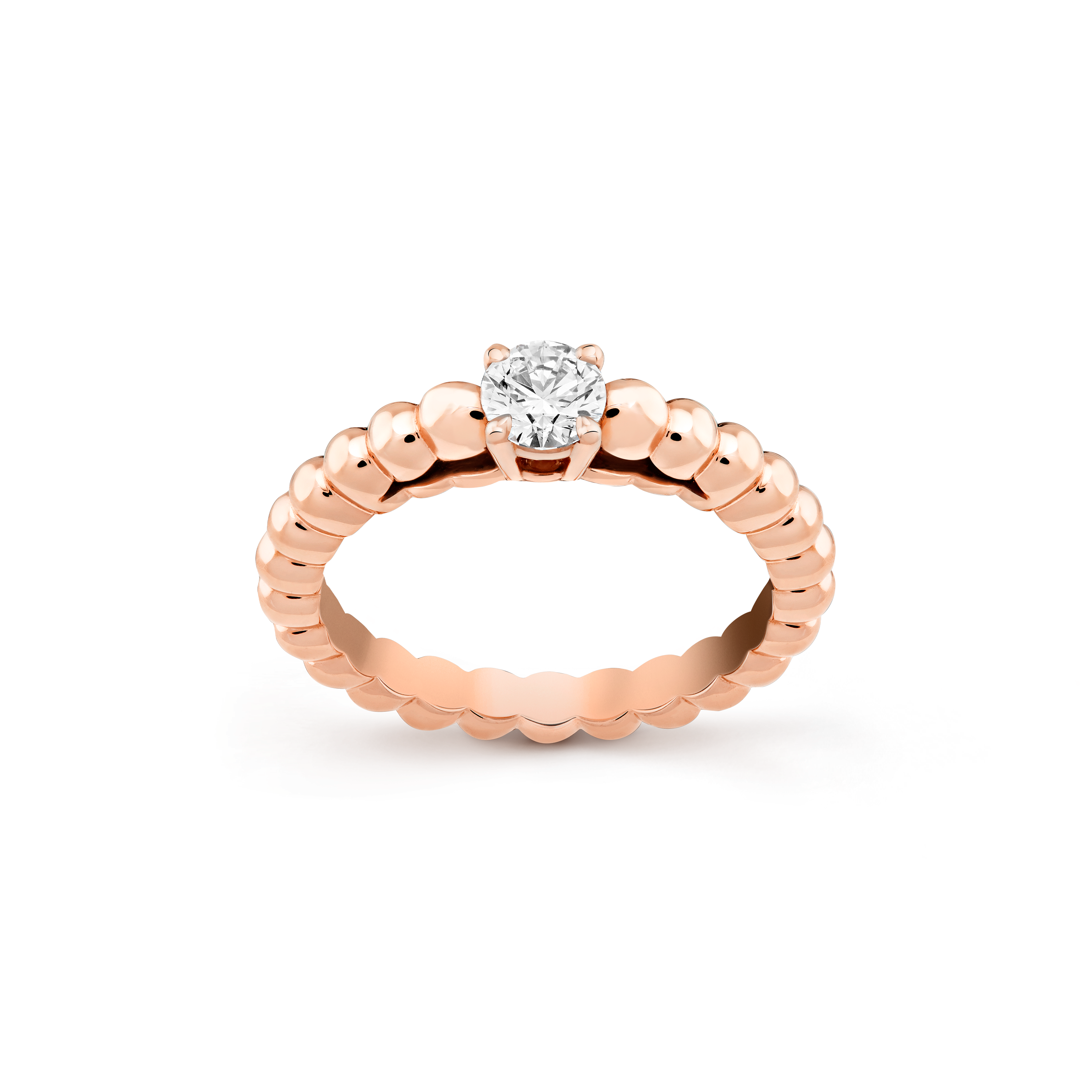 With curved lines, the Perlée® solitaire celebrates an emblematic skill of the Maison: pearls of gold, which adorn the outline of many a creation, in a soft, playful vision of jewelry. The shimmering beaded ring accentuates a superb center diamond.