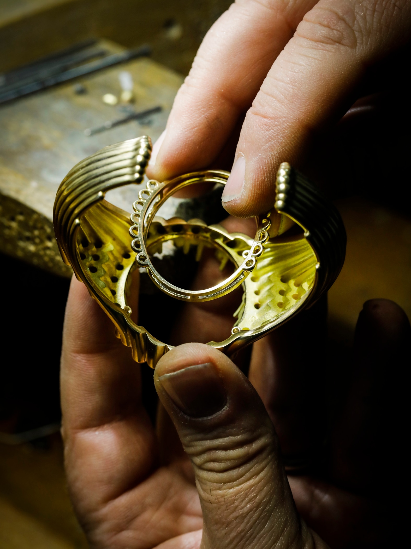 amid a wreath of yellow gold gadroons, forming a halo of light. Fine prongs of varied sizes delicately hold in place a stone with uniform color, smooth, brilliant finish.