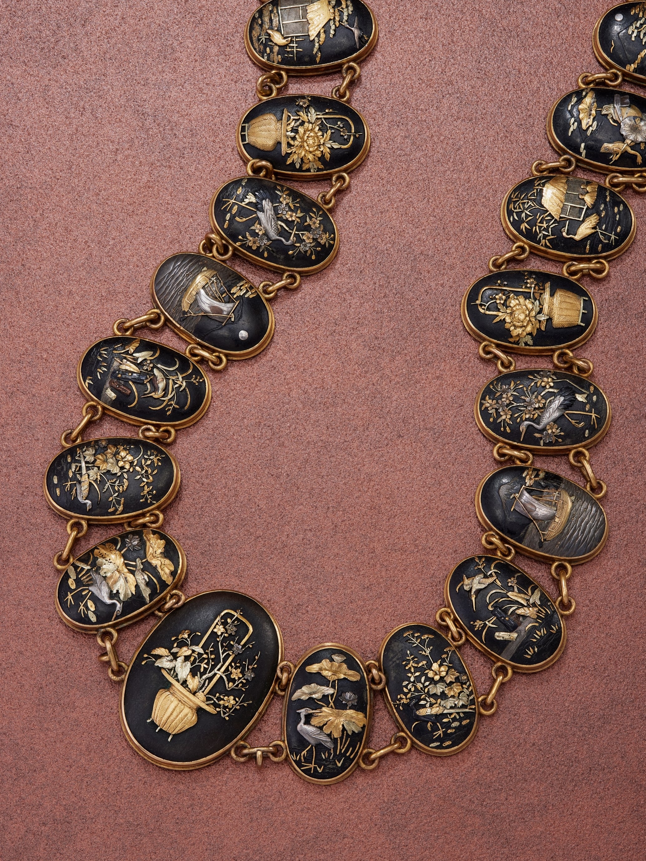 赤铜如何从武士刀装饰演变为珠宝作品,其背后隐藏着一段跌宕起伏的历史与政治事件。1853年,美国以武力迫使江户幕府开放国门,与外界通商,史称“黑船事件”。随之而来的封建制度瓦解与现代化推进,致使武士阶级日渐式微,直至1876年明治政府颁布废刀令,彻底禁止武士佩刀。失去主要客户的工匠们不得不寻求新的出路。在明治政府大力推动出口的政策驱使下,他们开始调整传统赤铜工艺,以迎合欧洲市场的审美需求,逐步转向制作赤铜材质的小型饰物。西方珠宝商被日本工匠的高超技艺深深吸引。他们利用金、铜、银等材质展现出瑰丽色彩,并在革新过程中将赤铜元素巧妙融入欧洲珠宝设计之中,取代了传统的浮雕和珐琅细工工艺。