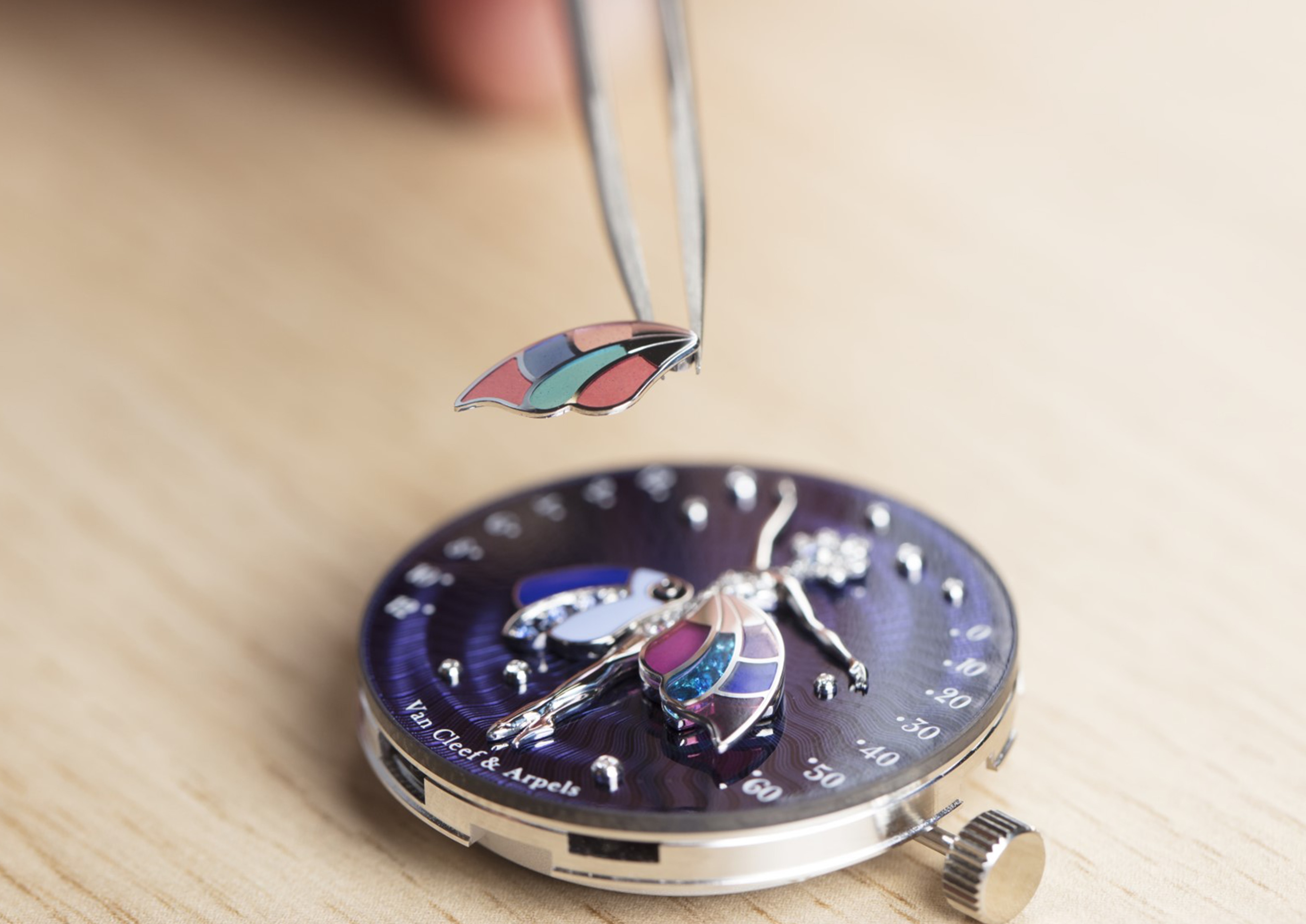 The dial of the Lady Arpels Féerie watch shows a playful and graceful fairy. A pear-cut diamond lights up her face. Her wings and body are set with brilliant-cut diamonds. Her magic wand transforms into the hour hand. One of her wings indicates the minutes. Perched on a piece of stardust, the fairy is ready to fly off into a deep blue enamel sky.