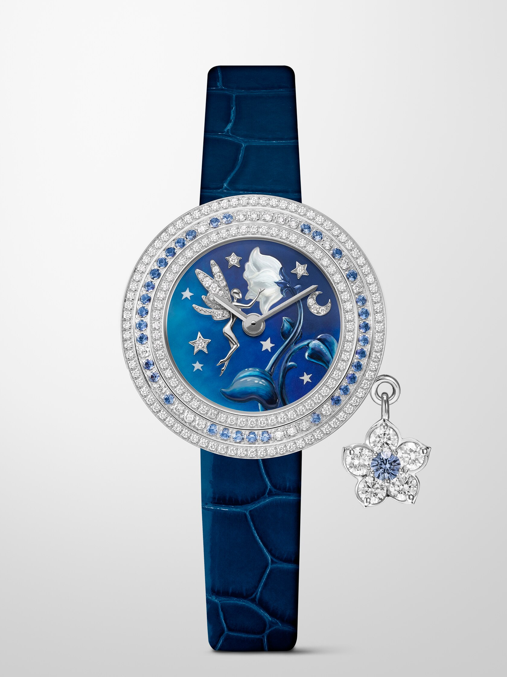 Like a protective muse, a fairy in a sapphire and diamond gown watches over Van Cleef & Arpels’ Poetry of Time™. Her face, depicted by a diamond, forms a dazzling contrast with the bluish tones of the sky, in guilloché mother-of-pearl. The same tones adorn her translucent wings, crafted from a combination of plique-à-jour and grisaille enamel.