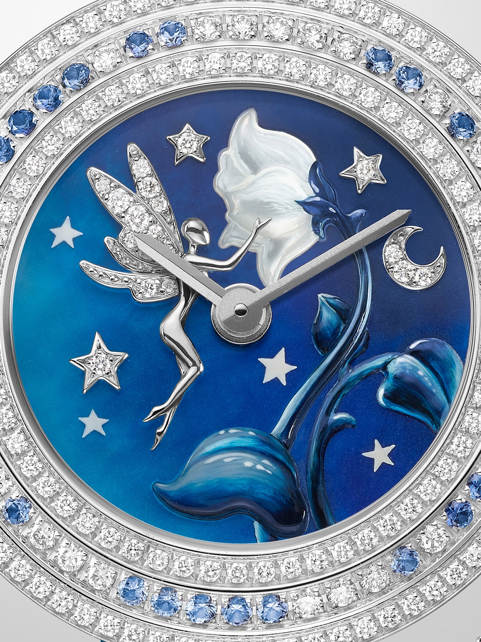Seated on a cloud of iridescent white mother-of-pearl, this feminine figure points out the minutes with her magic wand; meanwhile, the Moon harbors the passing hours in a window of mother-of-pearl, haloed by a gentle glow. On the back of the watch, the visible oscillating weight is engraved with a full Moon in a star-studded sky.
