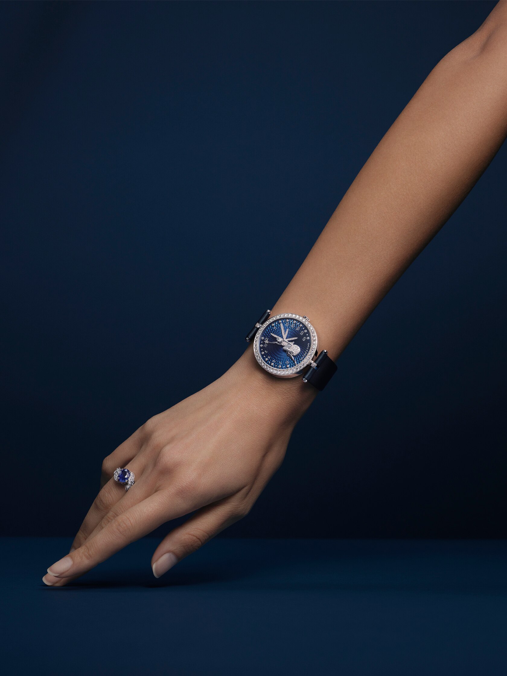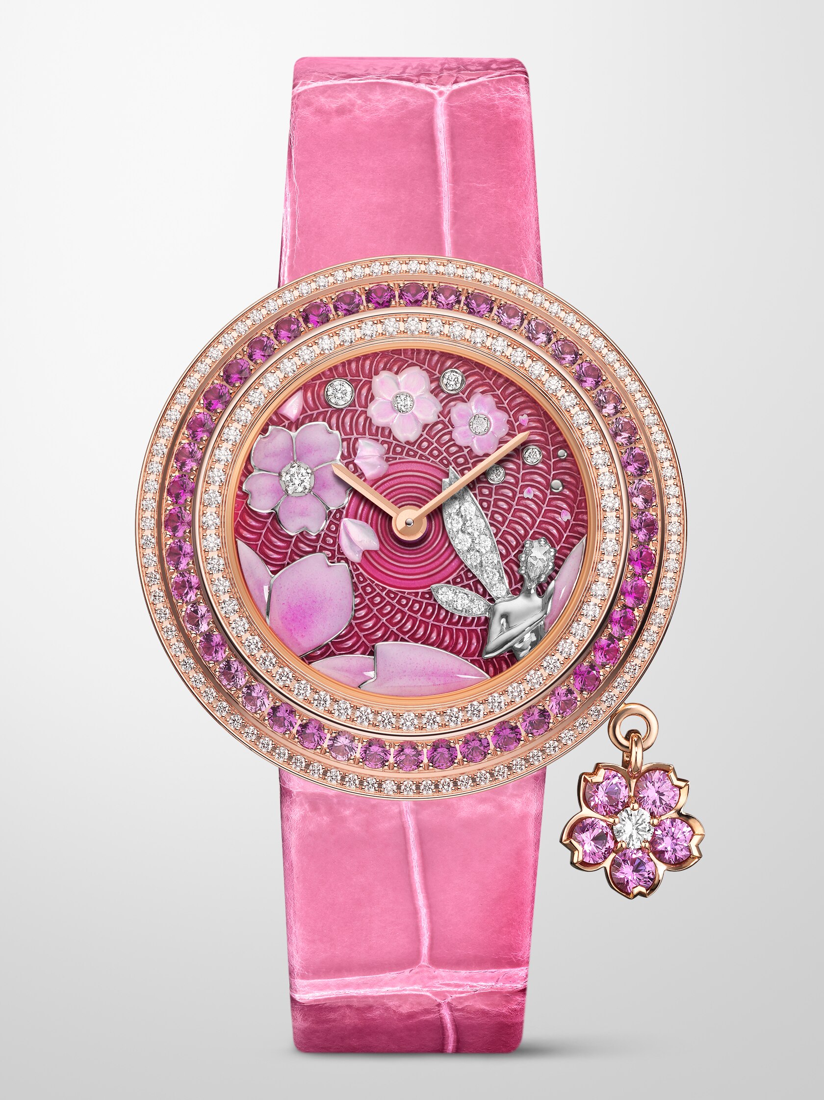 These feminine figures cast a benevolent eye over Van Cleef & Arpels’ flowered garden. The time can be read against a poetic scene, which is echoed by a lucky charm that rotates delicately around the case. Each detail bears witness to the Maison’s attachment to craft skills, which are here deftly combined.