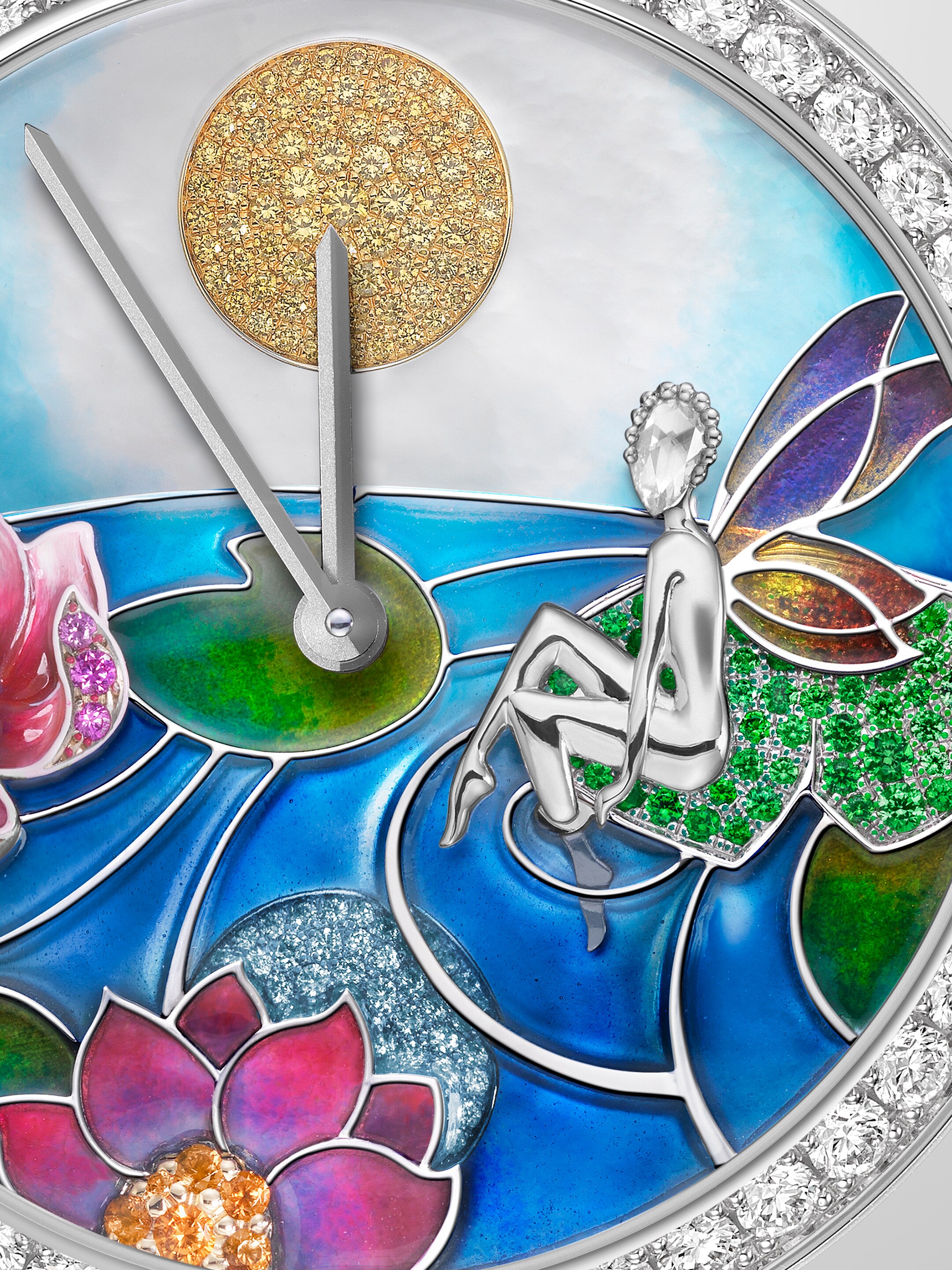 An Ondine fairy, gracefully sitting on a water lily, contemplates the sun and the moon alternating with each other in the sky. From dawn to dusk, a sky of painted mother-of-pearl setted with diamonds and yellow sapphires rotates to renew the scenery throughout the day.