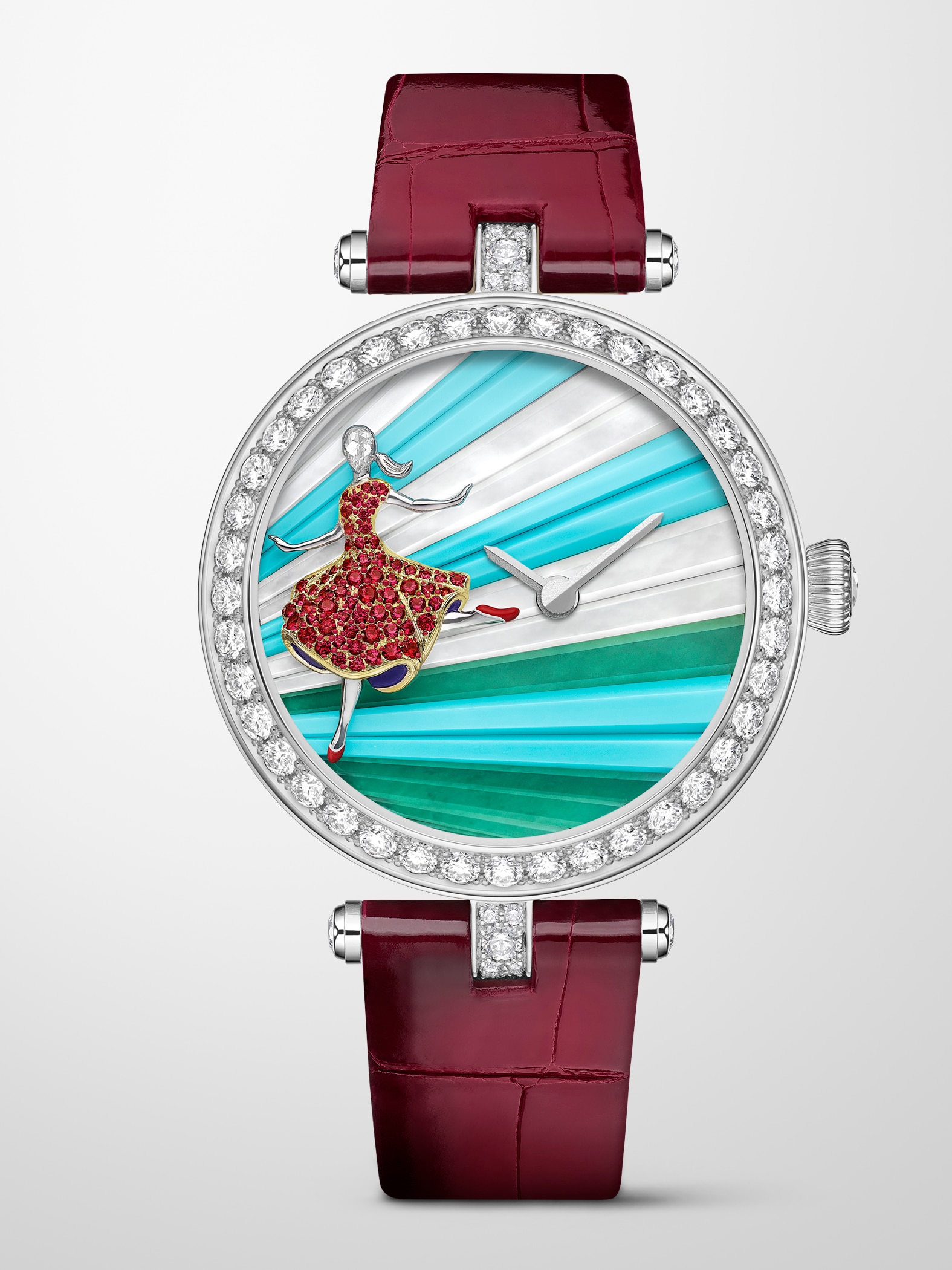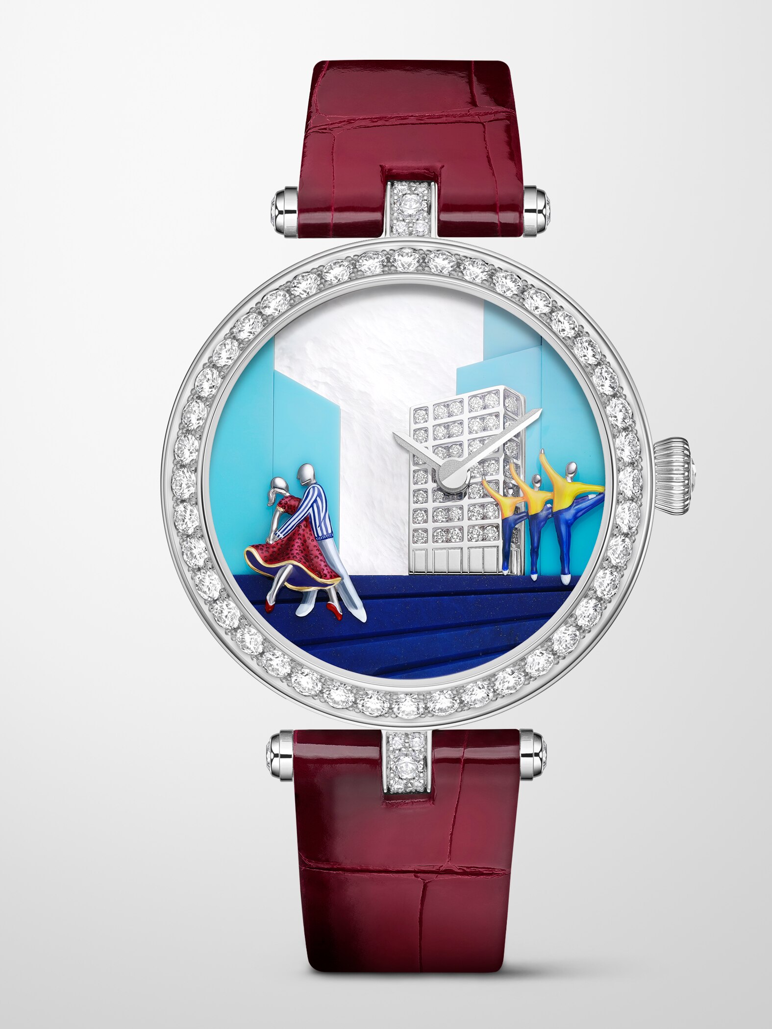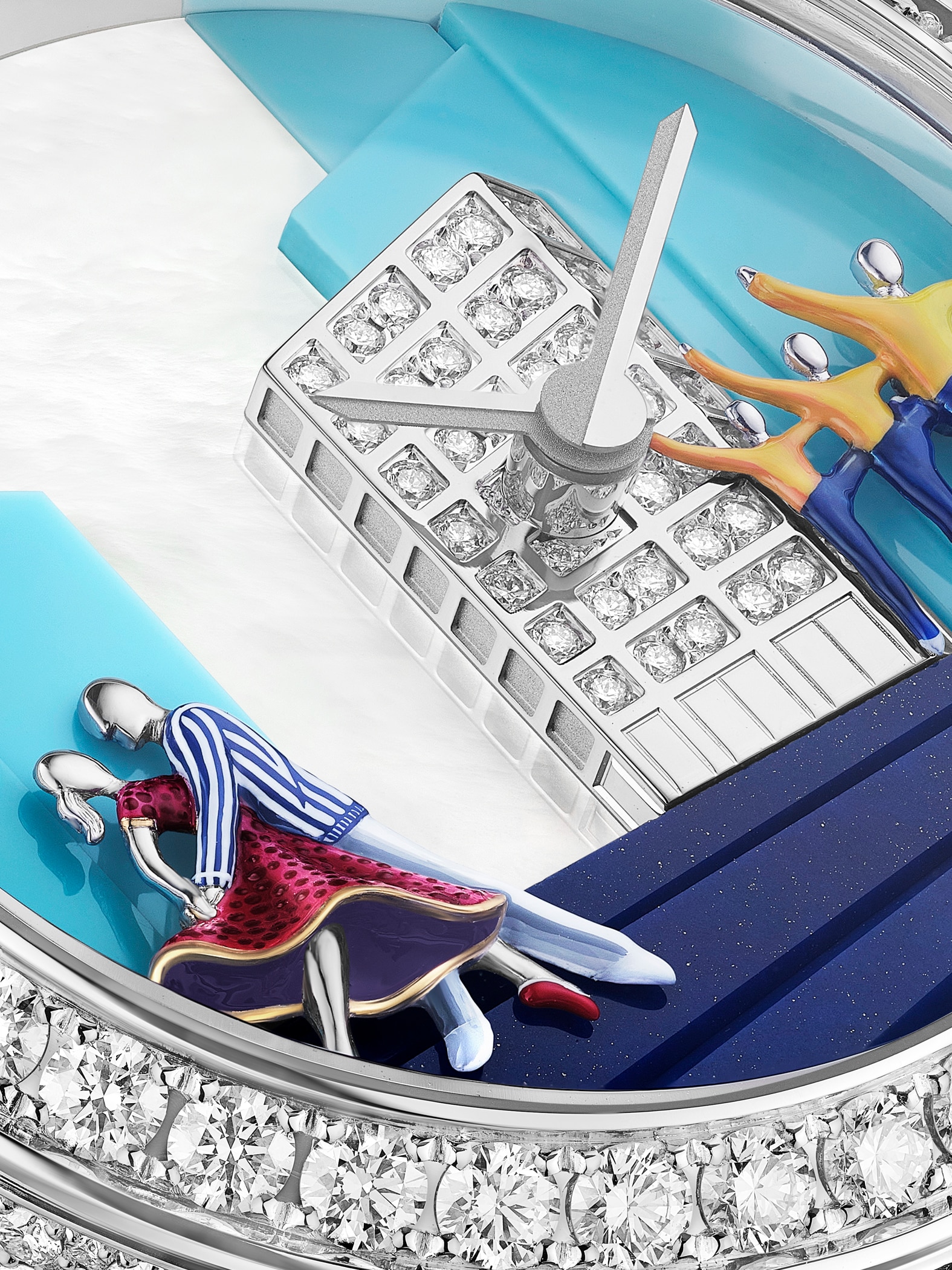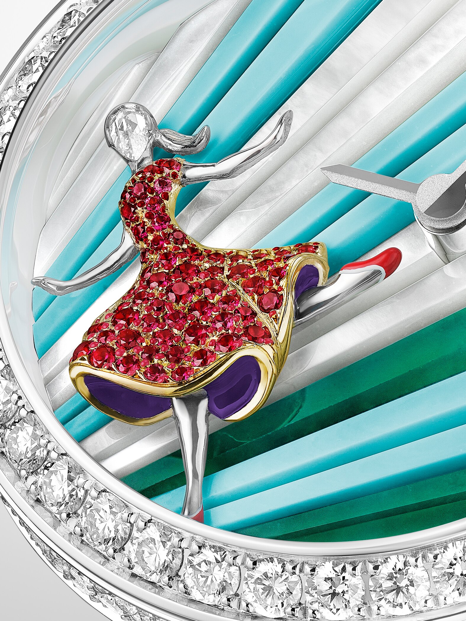 Respectively depicting a soloist going on stage and a group of dancers in a contemporary setting, these two watches evoke the excitement of Broadway in the 1950s and 1960s. Like true miniature tableaux combining precious and ornamental stones, these numbered editions offer a blend of contemporary lines, watchmaking savoir-faire and exceptional craftsmanship.