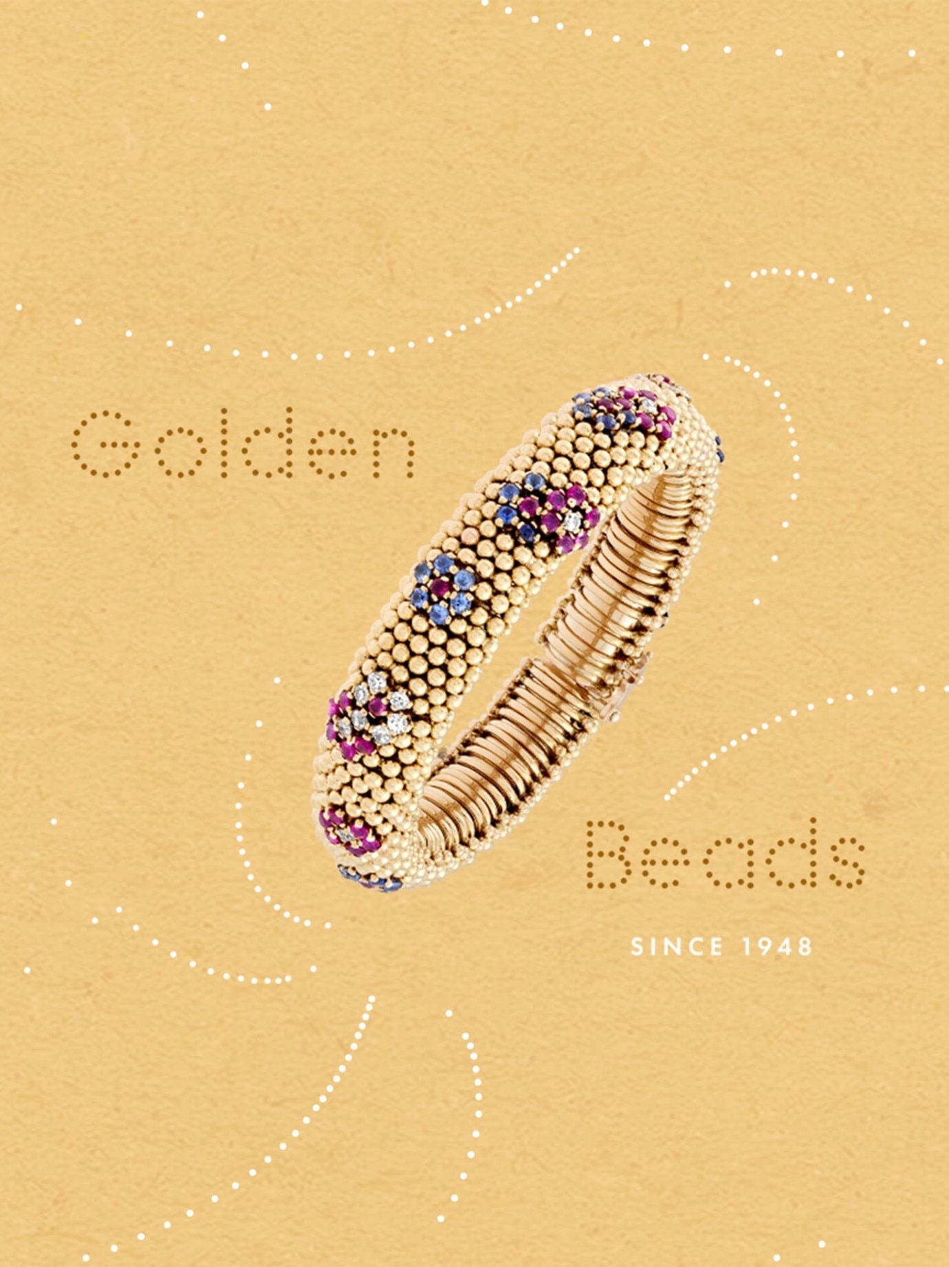 Accenting a gracious curve or framing a stone in the 1920s, golden beads became a motif in their own right as of 1948.