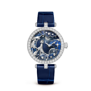 Van Cleef & Arpels梵克雅宝自备受世家珍视的两大主题汲取灵感,融汇爱情故事和诗意星象,雅呈Rencontre & Retrouvailles Célestes系列。珍贵作品描绘一段跨越时空的经典神话,将织女星与牛郎星的爱情传说娓娓道来。Lady Retrouvailles Célestes腕表描绘了这对爱侣翘首以盼的年度重逢画面,飞鸟振翅织就鹊桥,使他们得以再度相聚。表壳背面之上,织女星、牛郎星和天津四构成夏夜大三角星群,继续讲述着浪漫故事。