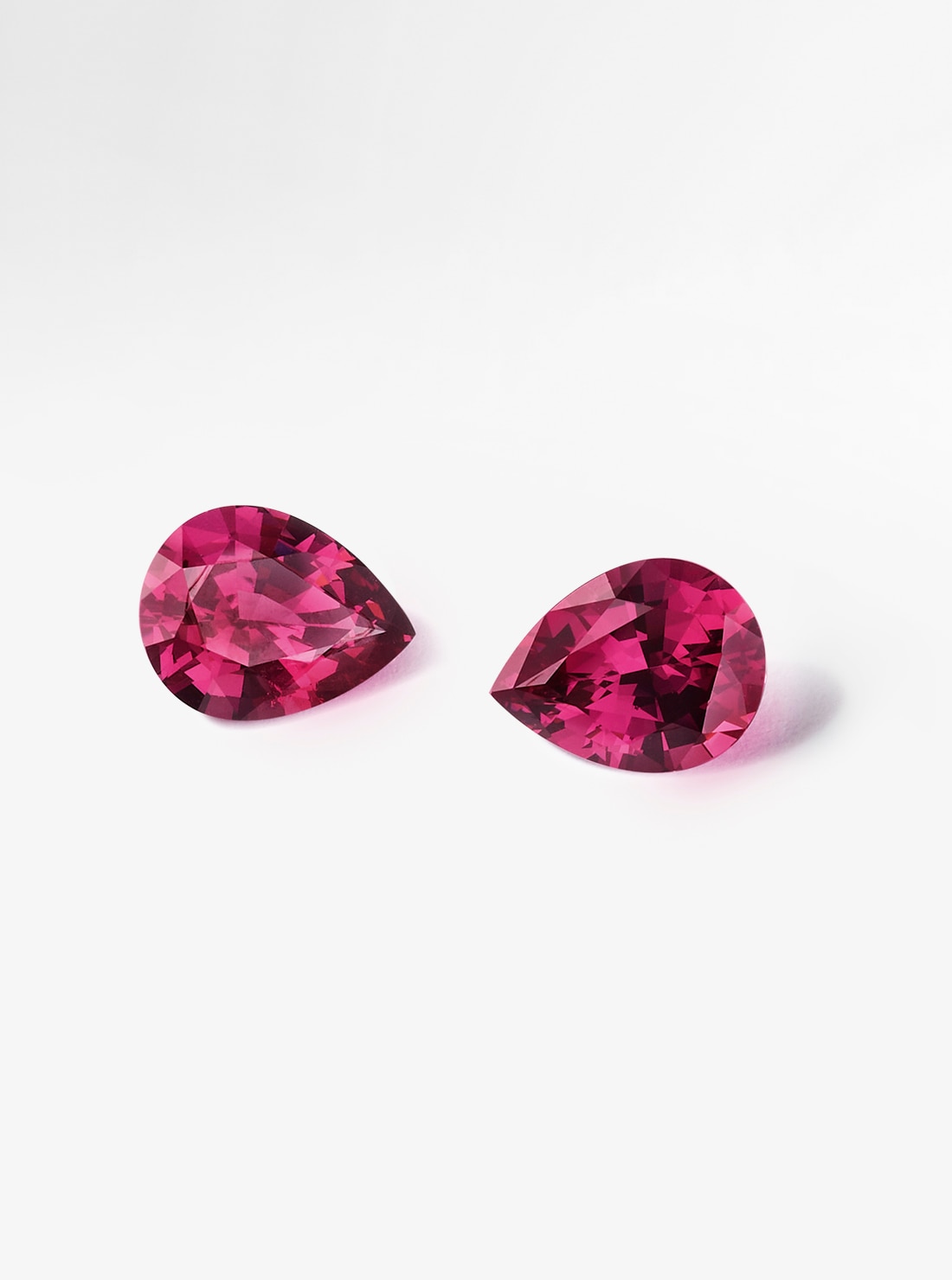 Rhodolite is a magnesium-iron silicate belonging to the garnet family. Varieties of garnet are named according to their color: rhodolite lies between the bright red pyrope garnet and the burgundy-red almadine garnet. Rhodolite is distinguished by its pinkish-red hue, which can veer towards violet. The Maison favors luminous, homogeneous stones, sometimes red with a pink cast, sometimes pink with a hint of violet.