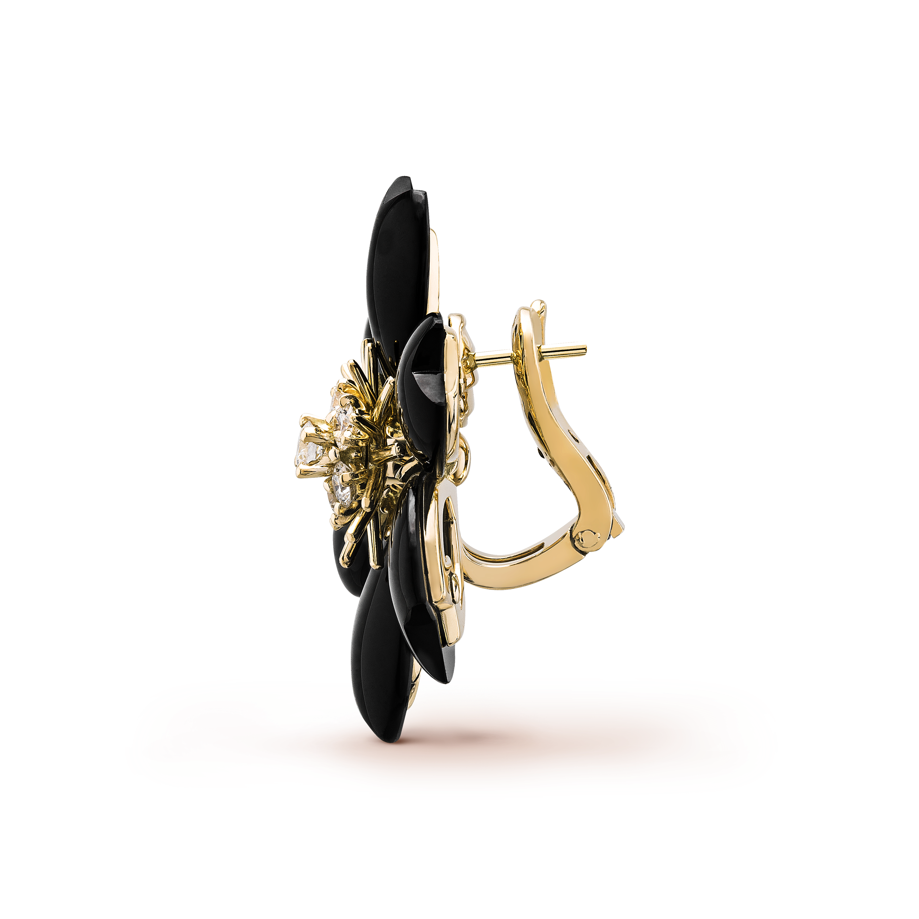 Rose de Noël earrings, small model 18K yellow gold, Diamond, Onyx
