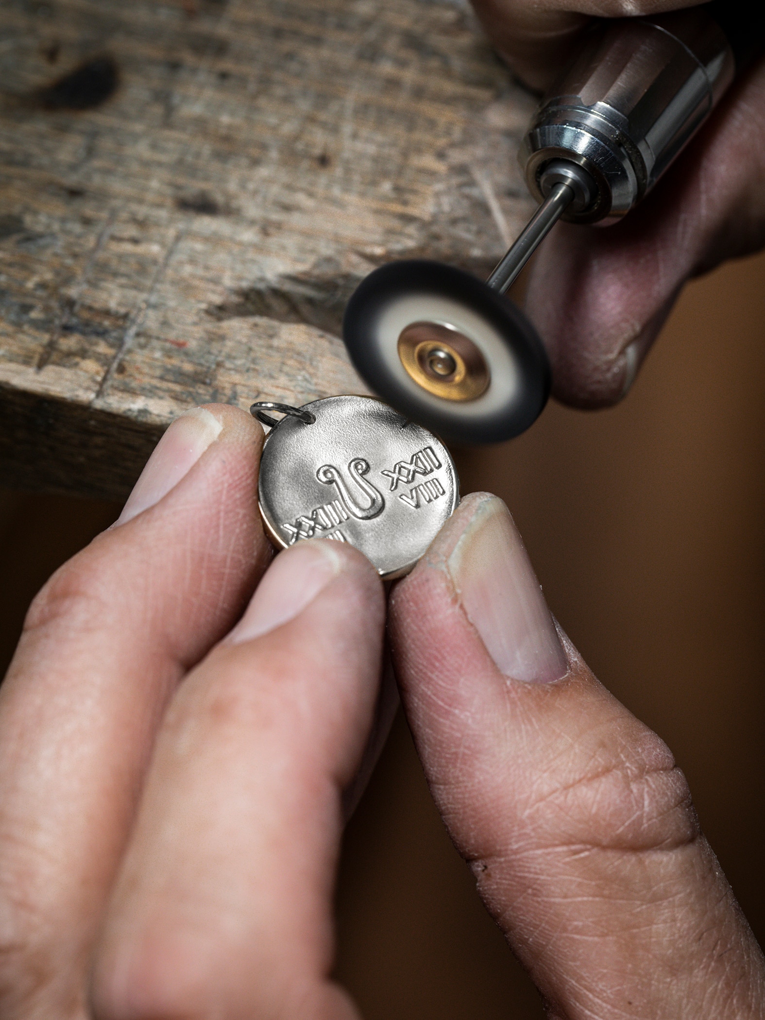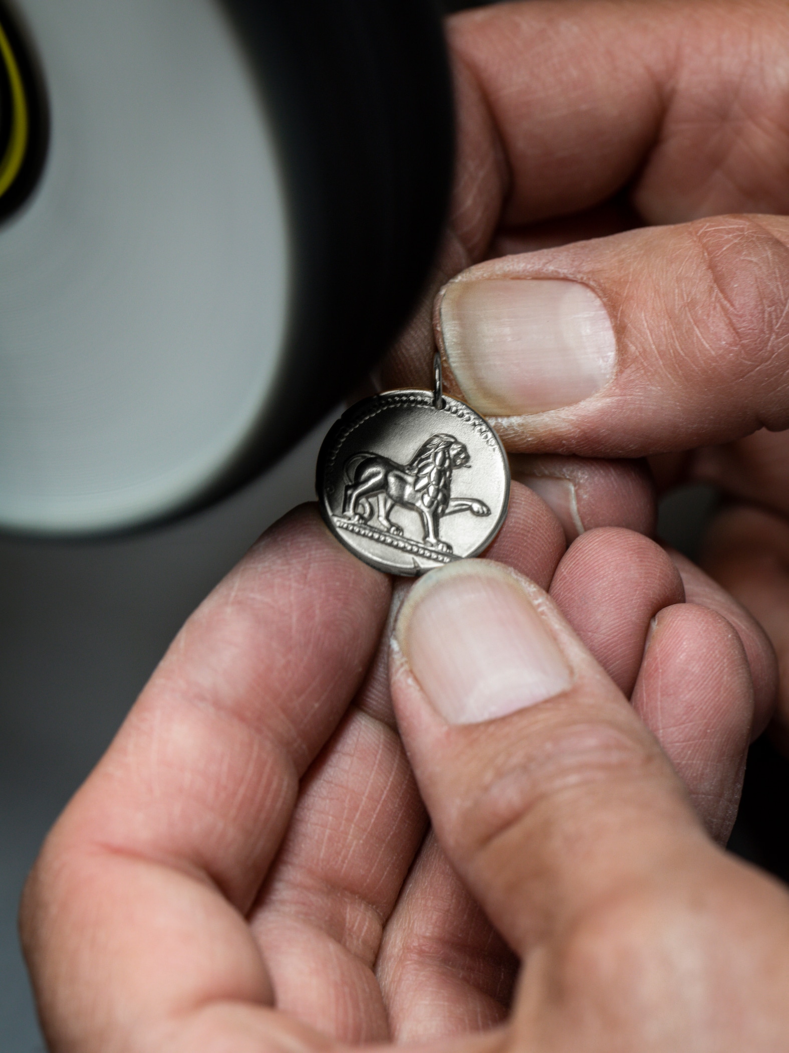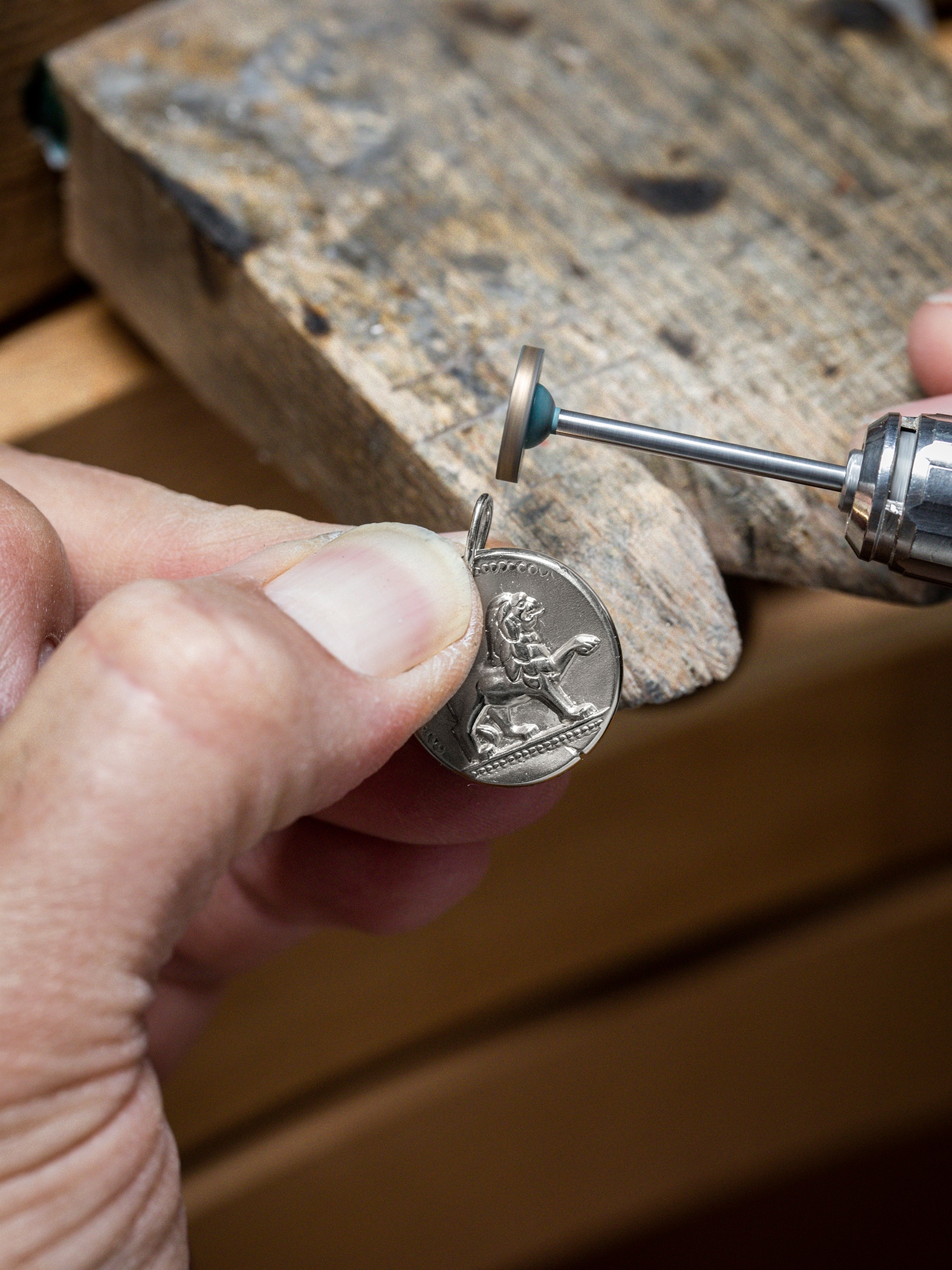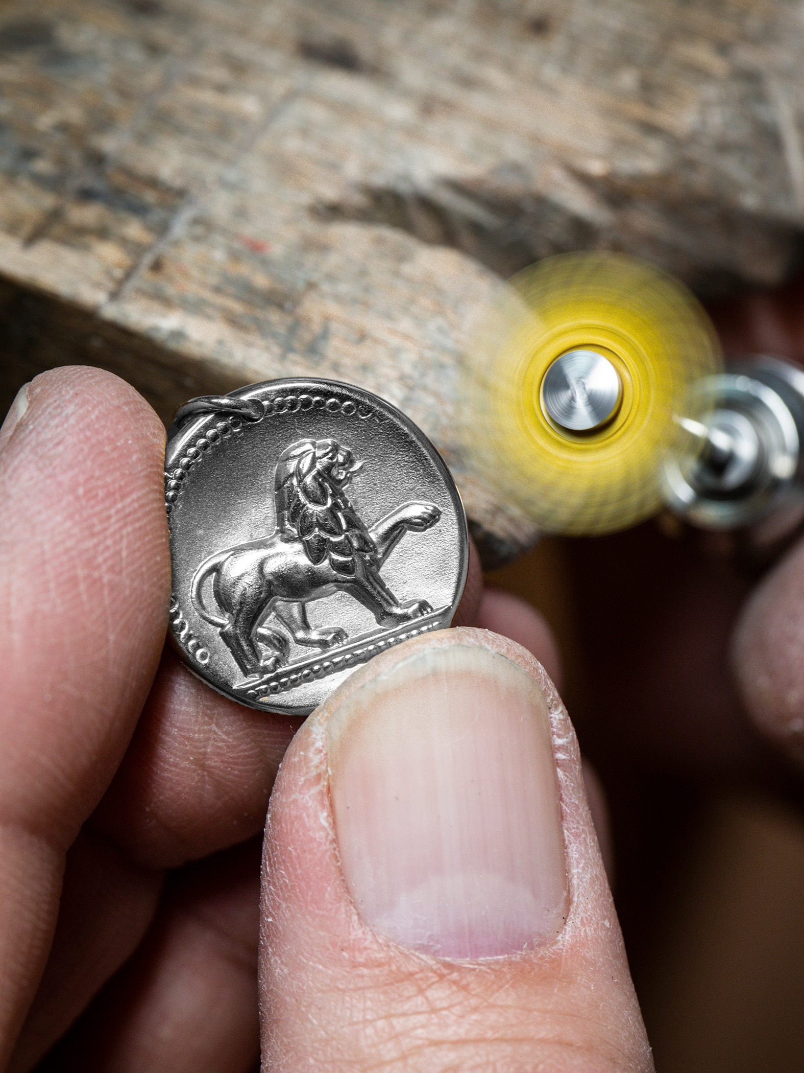 塑形後,金質經工匠悉心加工,賦予圓墜細緻的光澤。浮雕圖騰立體分明,仔細的拋光處理更賦予貴金屬耀眼光芒。